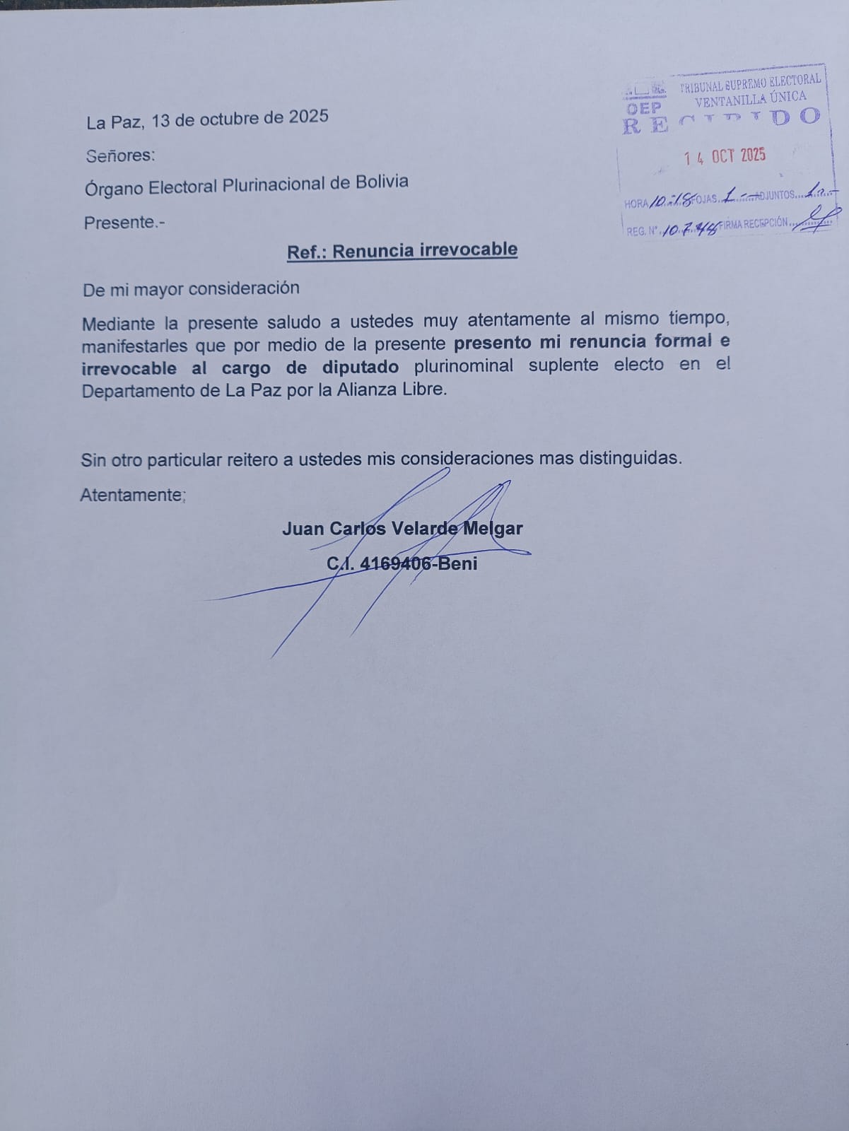 El vocero nacional de la alianza Libre, Carlos Palenque, informó este martes que el diputado suplente electo Juan Carlos Velarde esta mañana presentó oficialmente ante el Tribunal Supremo Electoral (TSE) su renuncia irrevocable a la diputación obtenida en las elecciones generales del 17 de agosto.
